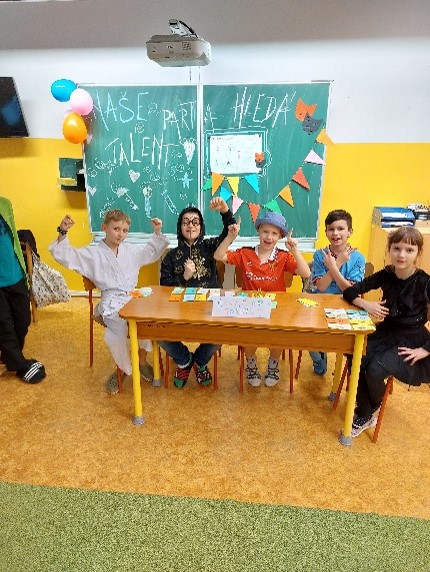 Ve středu 25.1.2023 jsme uskutečnili talentovou soutěž “Naše parta hledá talent“, která se konala v prostorách alternativní učebny (třídy družiny) V. oddělení. Přípravy probíhaly celý týden. Děti si měly připravit krátké vystoupení libovolného uměleckého nebo sportovního stylu bez omezení, ve kterém mohly ukázat svůj talent. Vystoupení dětí byla různorodá, zpěv, tanec, vtipné divadelní scénky, kouzlení a také ukázky sportovního talentu v gymnastice, judu i v bojovém umění. Po předvedeném vystoupení následovalo ohodnocení dětskou porotou. Všechna vystoupení byla velmi pěkná, děti zažívaly úspěch, povzbuzení, vzájemnou sounáležitost a co bylo nejkrásnější - vidět v dětských očích radost a nadšení. Po vystoupení byli všichni plni dojmů a soutěž by si rádi zopakovali. … a samozřejmě našli jsme Talenty.