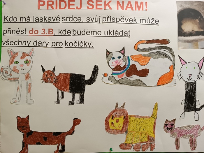 Žáci 3. B se se svou paní učitelkou zapojili do celorepublikového projektu Jsem laskavec. Denně je doprovází laskavý skutek, který udělají pro někoho jiného. Společně se domluvili a ve škole uspořádali sbírku pro opuštěné a zraněné kočičky. Paní učitelka všem štědrým dárcům koupila dárek. Výtěžek sbírky byl předán Nadaci na pomoc zvířatům v Ostravě - Porubě a Second Chance azylu pro kočky v Ostravě – Přívoze. Děkujeme všem laskavým dárcům – žákům, jejich rodičům i zaměstnancům školy. Když žáci s paní učitelkou hodnotili efekt sbírky, všichni se shodli. Mají dobrý pocit z toho, že mohli dát několika desítkám kočiček něco na přilepšenou.