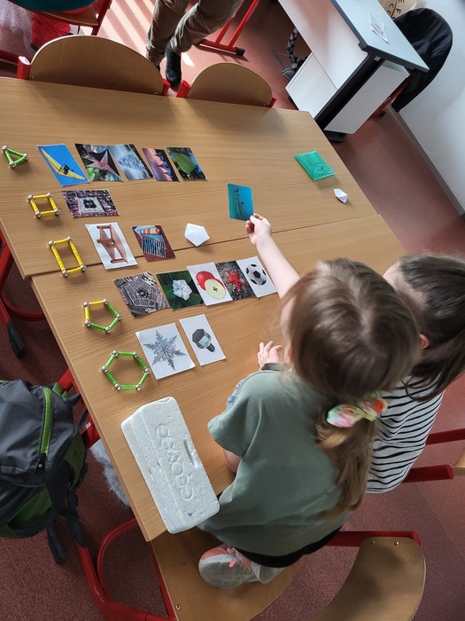 Dne 23. 4. jsme navštívili výukový program Geometrický svět ve Velkém světě techniky. Před začátkem programu jsme měli možnost si zahrát domino a pexeso s geometrickými tvary a dokreslit nedokončený obraz dle naší fantazie. S panem lektorem jsme si procvičili geometrické tvary. Měl pro nás připravené příklady geometrických tvarů, které můžeme najít v přírodě a které vytvořil člověk. Pracovali jsme s Tangramem a stavebnicí Geomag.