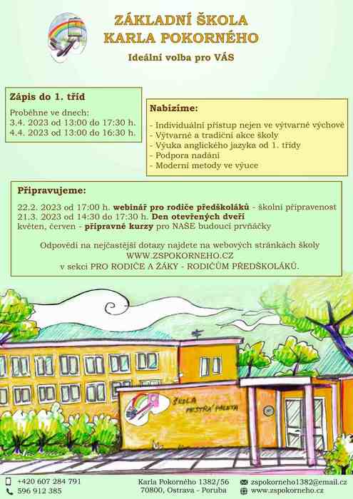 Zápis do 1. tříd se koná v souladu s § 36 odst.4 zákona č. 561/2004 Sb, o předškolním, základním, středním, vyšším odborném a jiném vzdělávání (školský zákon), ve znění pozdějších předpisů, v době od 1. dubna do 30. dubna kalendářního roku, v němž má dítě zahájit povinnou školní docházku. Konkrétní termín stanoví ředitelka školy pro školní rok 2023/2024 takto: