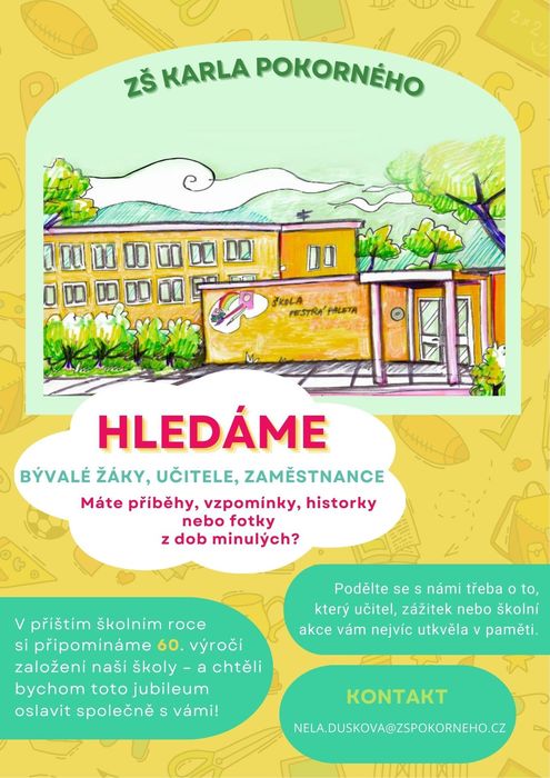 V příštím školním roce si připomínáme 60. výročí založení naší školy – a chtěli bychom toto jubileum oslavit společně s vámi! Hledáme příběhy, vzpomínky, historky a fotky z dob minulých. Byli jste u nás žáky, učiteli, zaměstnanci nebo jste jinak spojeni se školou? Podělte se s námi třeba o to, který učitel, zážitek nebo školní akce vám nejvíc utkvěla v paměti. Můžete nám napsat do komentářů, do zpráv nebo na e-mail nela.duskova@zspokorneho.cz. Vaše vzpomínky poté budou součástí mini výstavy při oslavách výročí.