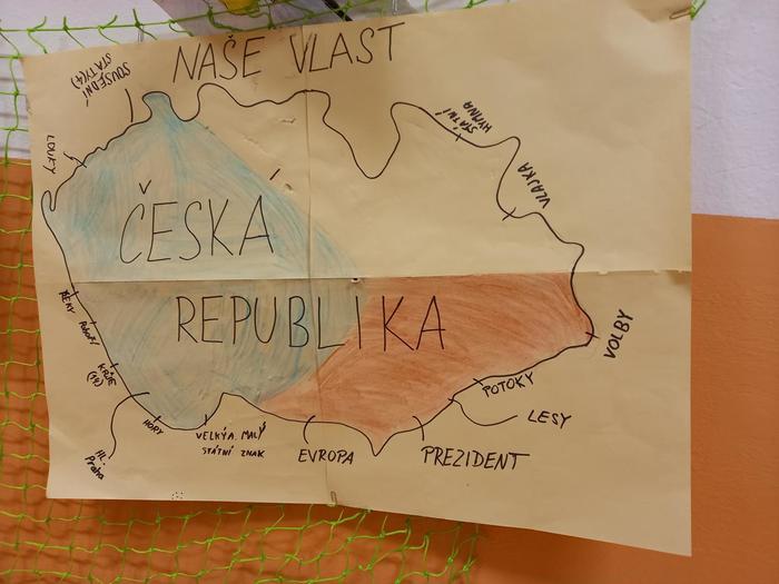 Samostatně vytvořily myšlenkovou mapu České republiky. Povídali jsme si o tom, jaké má ČR státní symboly, kraje, sousední státy. Děti ve dvojicích vyplnily pracovní listy, kde kraje a sousední státy ČR zaznačily. Poslední den jsme vytvořili vlaječku naší republiky.